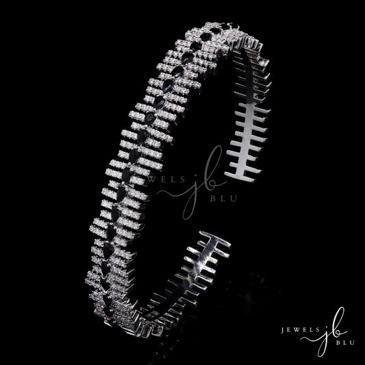 Premium American Diamond Baguette Setting Three Line Nora Openable Bracelet with Blue Sapphire Detailing
