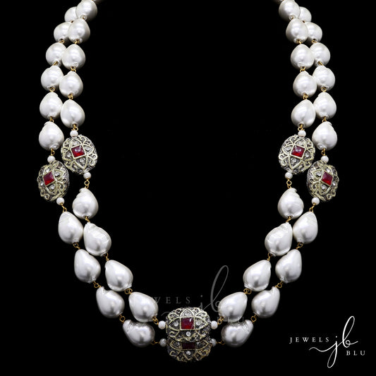 Baroque Pearl and Polki 2 Line Necklace Set with Ruby Detailing