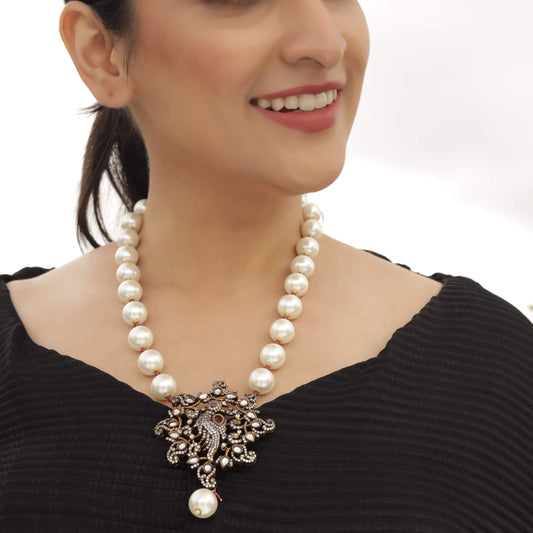 White Pearl Antique Finished Peacock Pendant Long Necklace