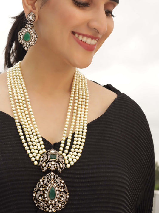 Pearl and Emerald Antique Finish Kundan Polki Long Necklace Haar