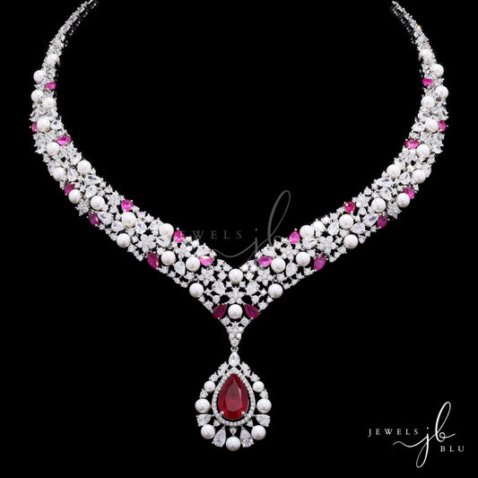 • Premium Ruby  Drop and Fresh Water Pearl Nytara Necklace Set with Earrings