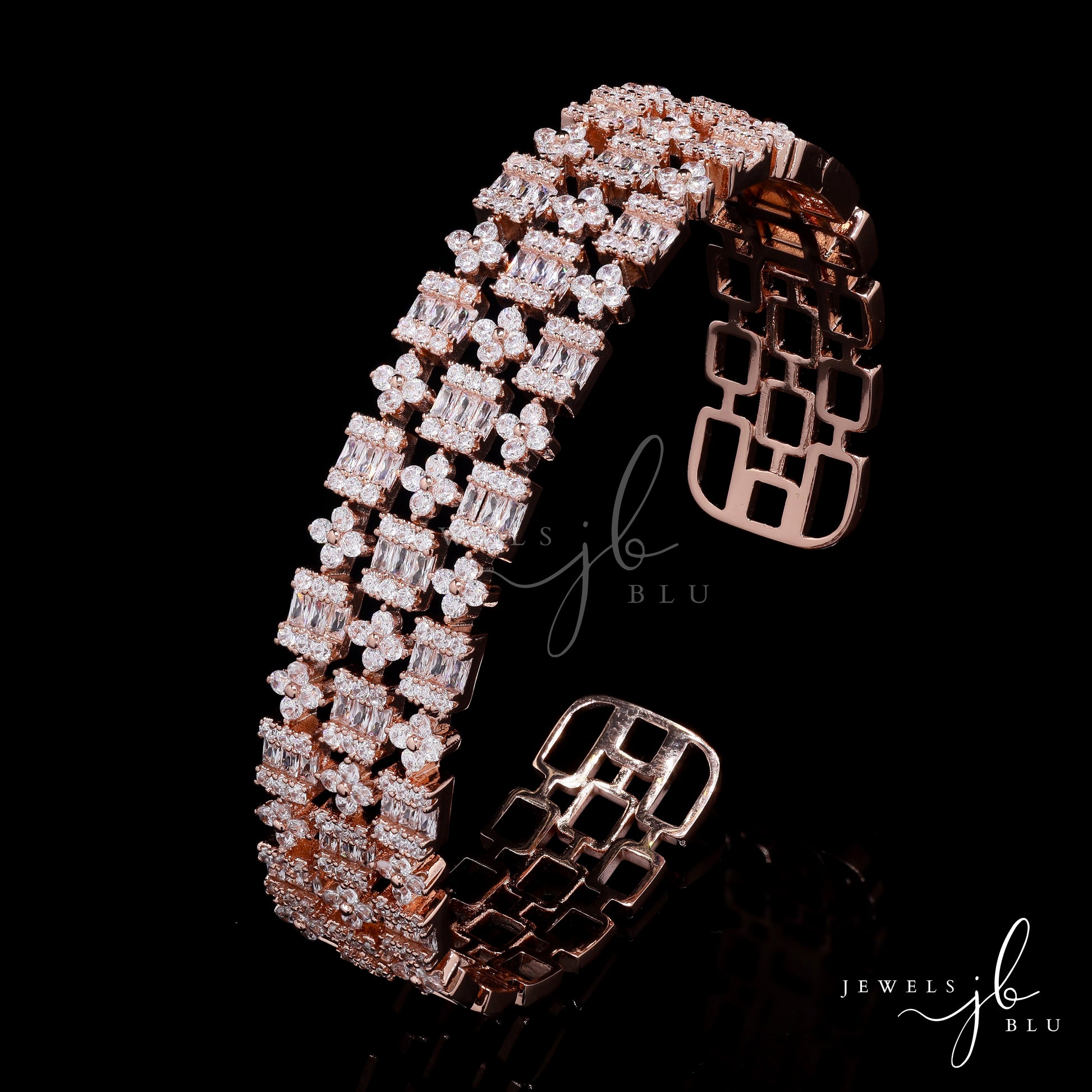 Premium Rose Gold Finish American Diamond Baguette and Round Cut Pressure Setting Broad Bridal Openable Bracelet