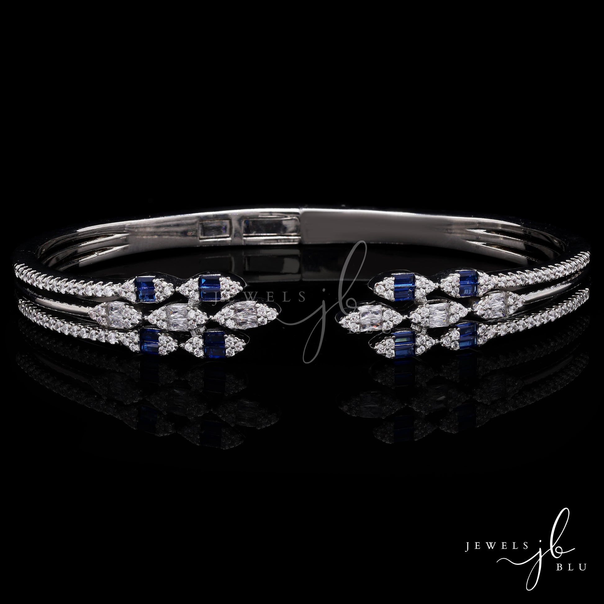 Premium American Diamond Baguette Setting Three Line Nora Openable Bracelet with Blue Sapphire Detailing