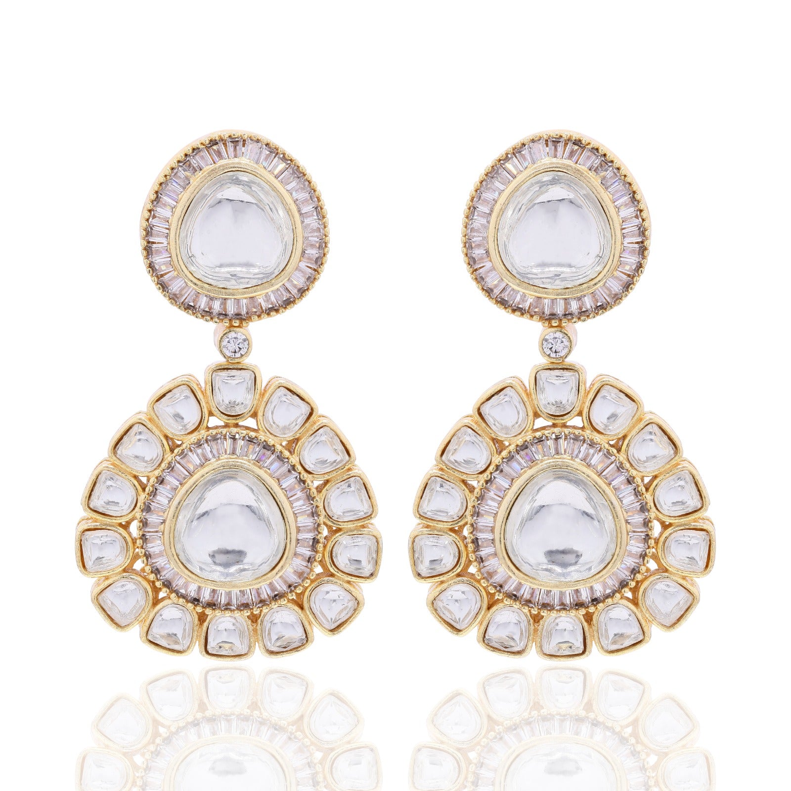 An absolute bestseller, these beautiful polki diamond earrings in gold finish handcrafted on High Finish Brass