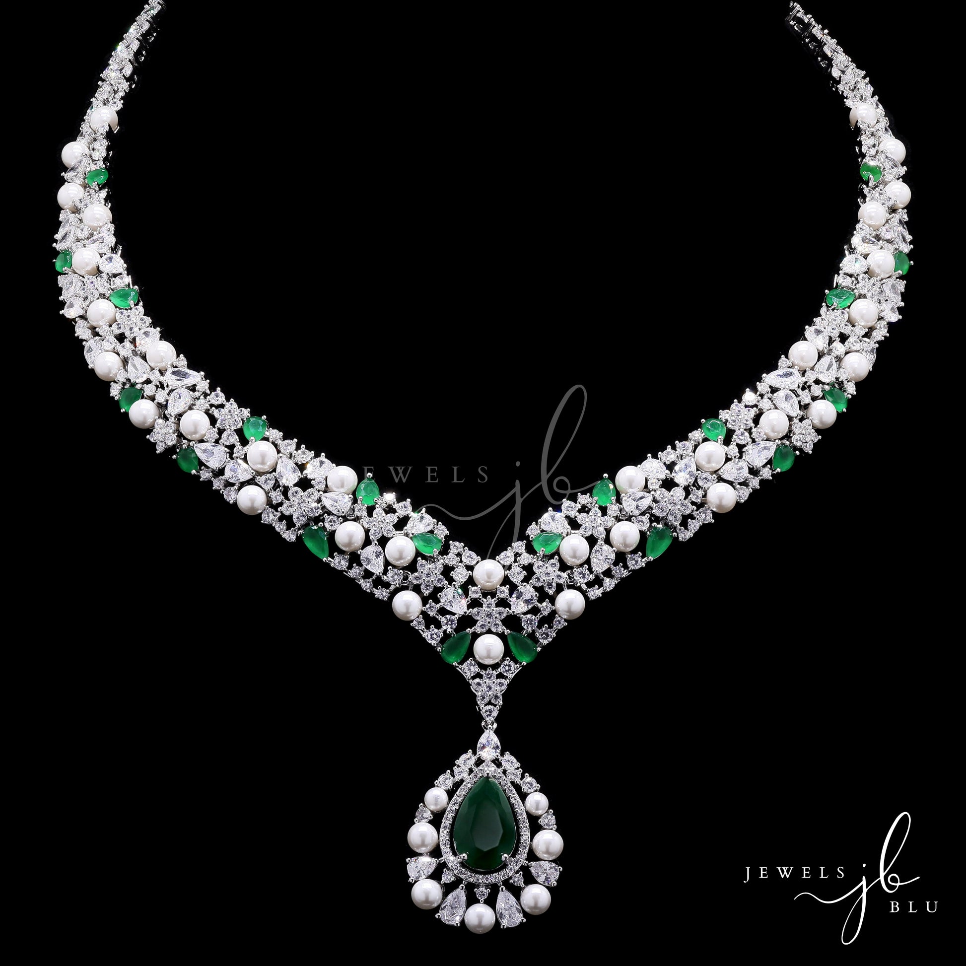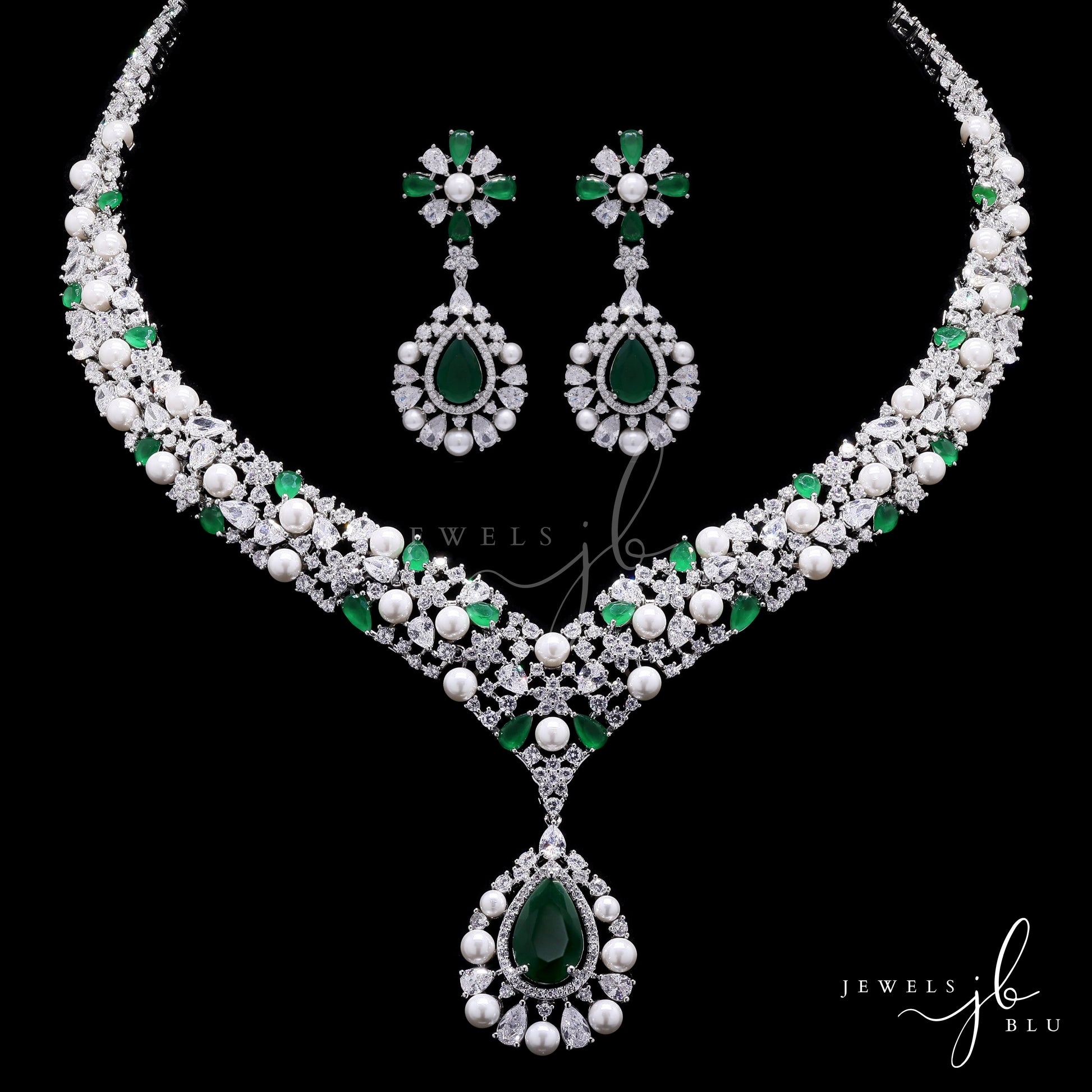 Premium Emerald Drop and Fresh Water Pearl Nytara Necklace Set with Earrings