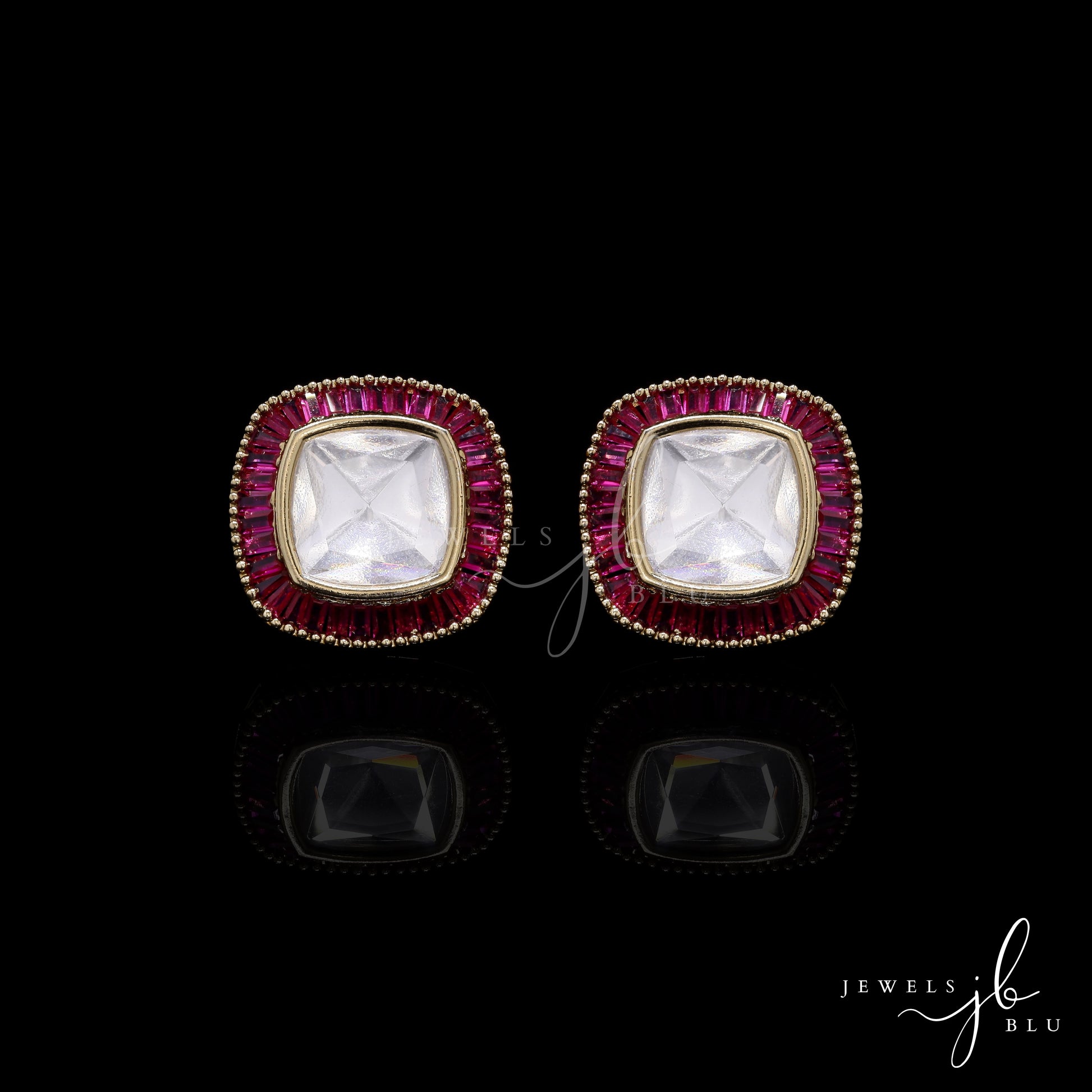 A Beautiful Pair of Antique Gold Finish Studs with a Centre Far Sized Polki and Ruby Baguettes in Cluster.
